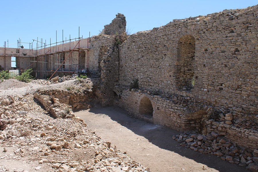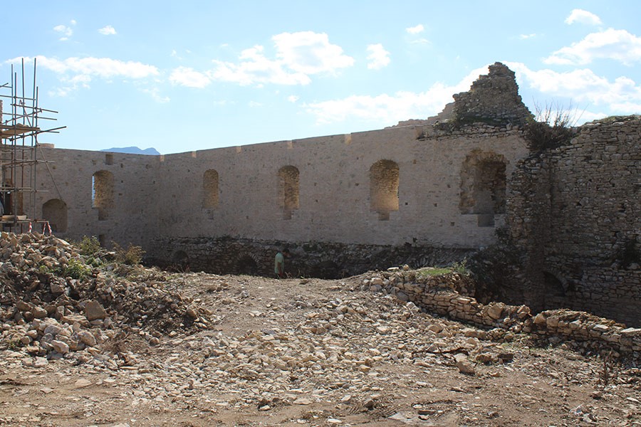 Στη βόρεια πλευρά του κάστρου έχουν αφαιρεθεί επιχώσεις για τον εντοπισμό του σχεδόν κατεστραμμένου βόρειου τείχους. Στη βορειοανατολική πλευρά της οχύρωσης πραγματοποιήθηκε ανακατασκευή της κατεστραμμένης βορειοανατολικής γωνίας και γίνονται εργασίες καθαρισμού και αποκατάστασης. Στο νότιο και στο ανατολικό τείχος έχουν γίνει εργασίες αποκατάστασης και συμπλήρωσης με λιθοδομή στα εξωτερικά ανοίγματα και στις σπηλαιώσεις. Στη να πλευρά της οχύρωσης έχουν ολοκληρωθεί οι εργασίες αποκατάστασης του περίδρομου και η επίστρωσή του με κονίαμα και έχουν σχεδόν ολοκληρωθεί οι εργασίες λιθοσυμπλήρωσης των τοξοθυρίδων και των παραθύρων, καθώς και η αρμολόγηση των όψεων της οχύρωσης εσωτερικά και εξωτερικά. Στον ανατολικό πύργο έχουν αφαιρεθεί με ανασκαφική μέθοδο εκτεταμένες επιχώσεις από την περίμετρο και το εσωτερικό του προκειμένου να εντοπιστούν τα ίχνη των περιμετρικών τοιχοποιιών του, κυρίως στις πλάγιες πλευρές και στη δυτική όψη του και ακολούθησε η αποκατάσταση των εν λόγω πλευρών (οι οποίες έχουν ξεπεράσει σε ύψος τα 5μ. περίπου). Ακολούθως και προκειμένου να ενισχυθεί στατικά η ανατολική πλευρά του πύργου, η οποία σώζεται σε ύψος 12μ. περίπου, ξανακτίστηκε ολόκληρη η εσωτερική όψη της. Στον ανατολικό πύργο έχουν επίσης αποκατασταθεί πλήρως τέσσερις από τις εφτά τοξοθυρίδες του και έχει ανακατασκευαστεί στο μέσο περίπου της δυτικής πλευράς η θύρα εισόδου σε αυτόν. Στις εξωτερικές όψεις του πύργου έχει γίνει καθαίρεση των παλαιών σαθρών κονιαμάτων και εφαρμογή νέων, ενώ για την εξασφάλιση της στατικής του επάρκειας έχουν τοποθετηθεί ανοξείδωτοι μεταλλικοί ελκυστήρες σε επάλληλες στάθμες. Στον νότιο πύργο έχει γίνει αφαίρεση επιχώσεων από το εσωτερικό του και έχει γίνει αποκατάσταση της εσωτερικής παρειάς του ανατολικού τοίχου του ενώ βρίσκονται σε αρχικό στάδιο οι εργασίες ανακατασκευής των κατεστραμμένων εξωτερικών όψεών του”.